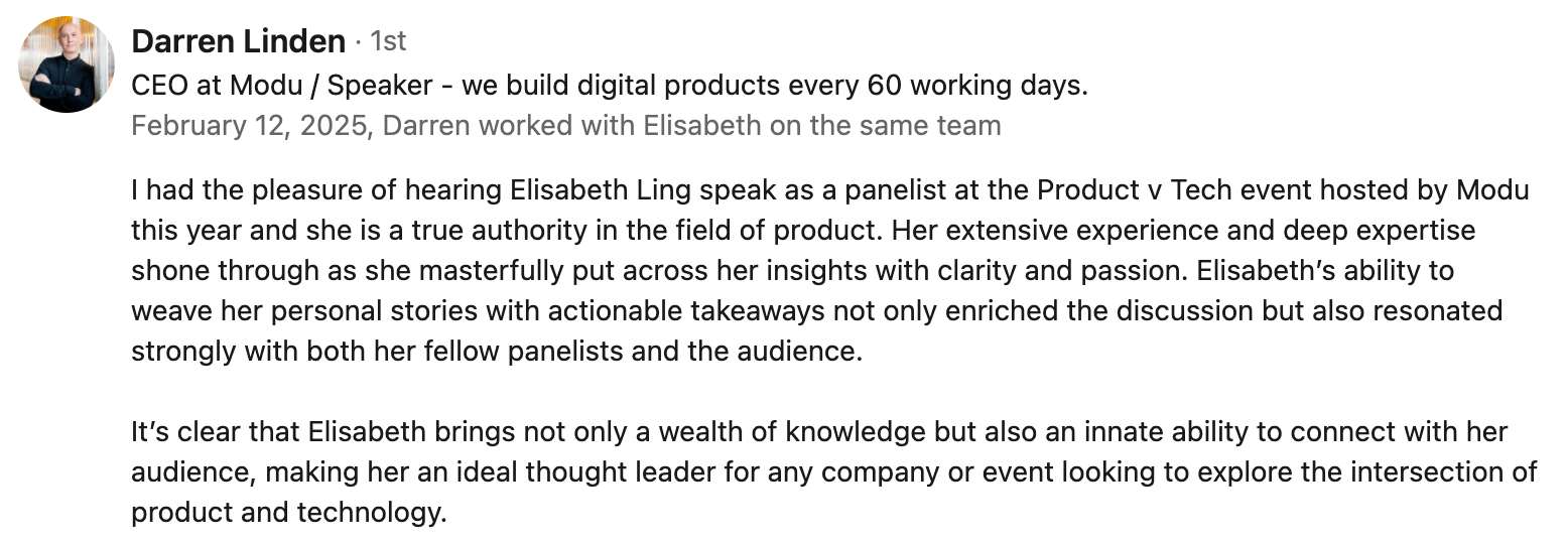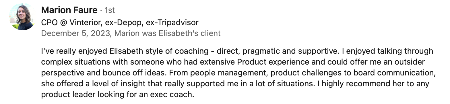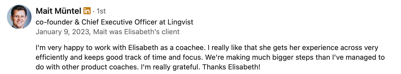 What CEOs and Product Leaders sayProduct Leadership Coaching testimonialsFeedback from leaders who worked directly with me as an operatorPublic speaking testimonials